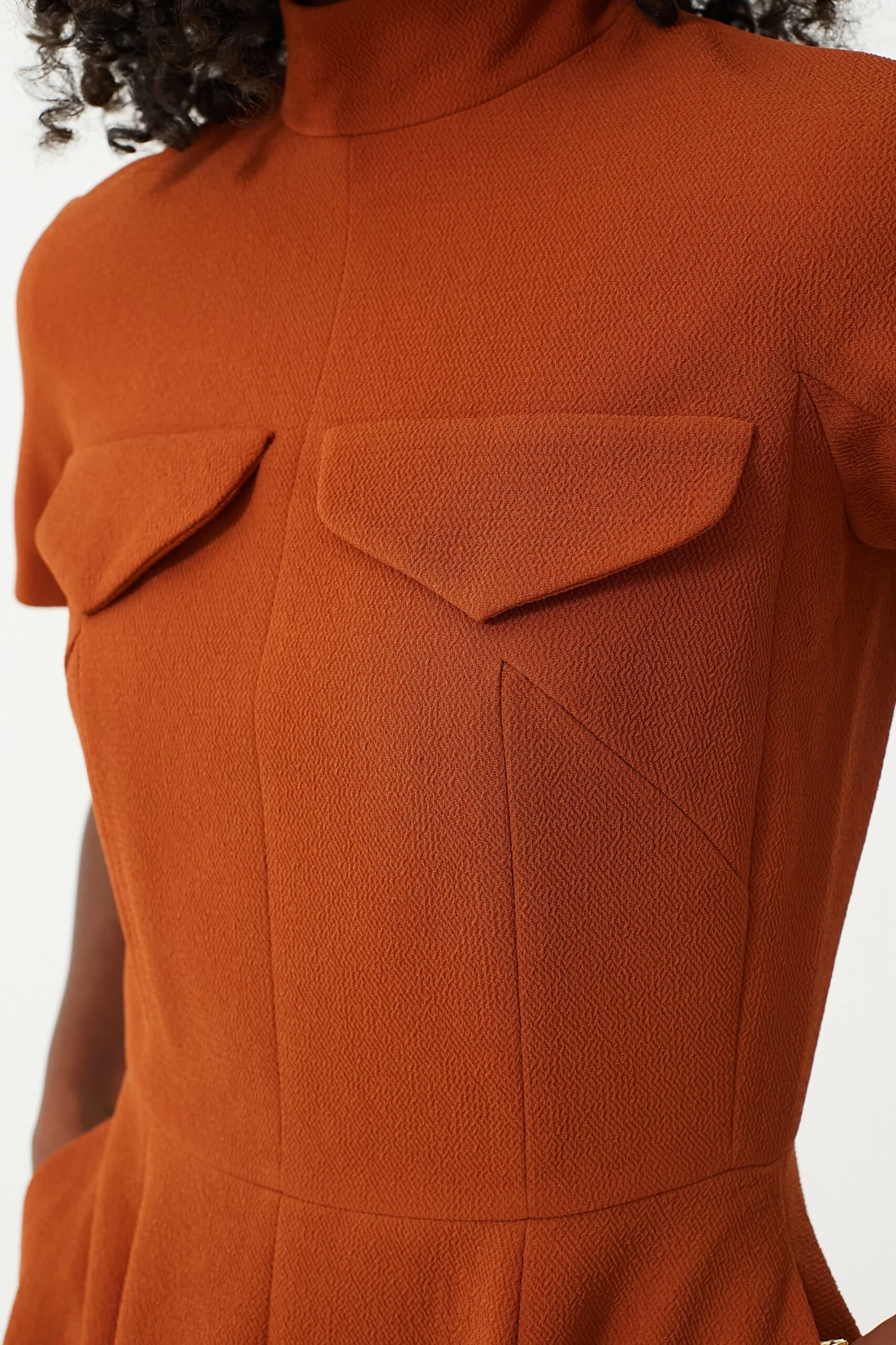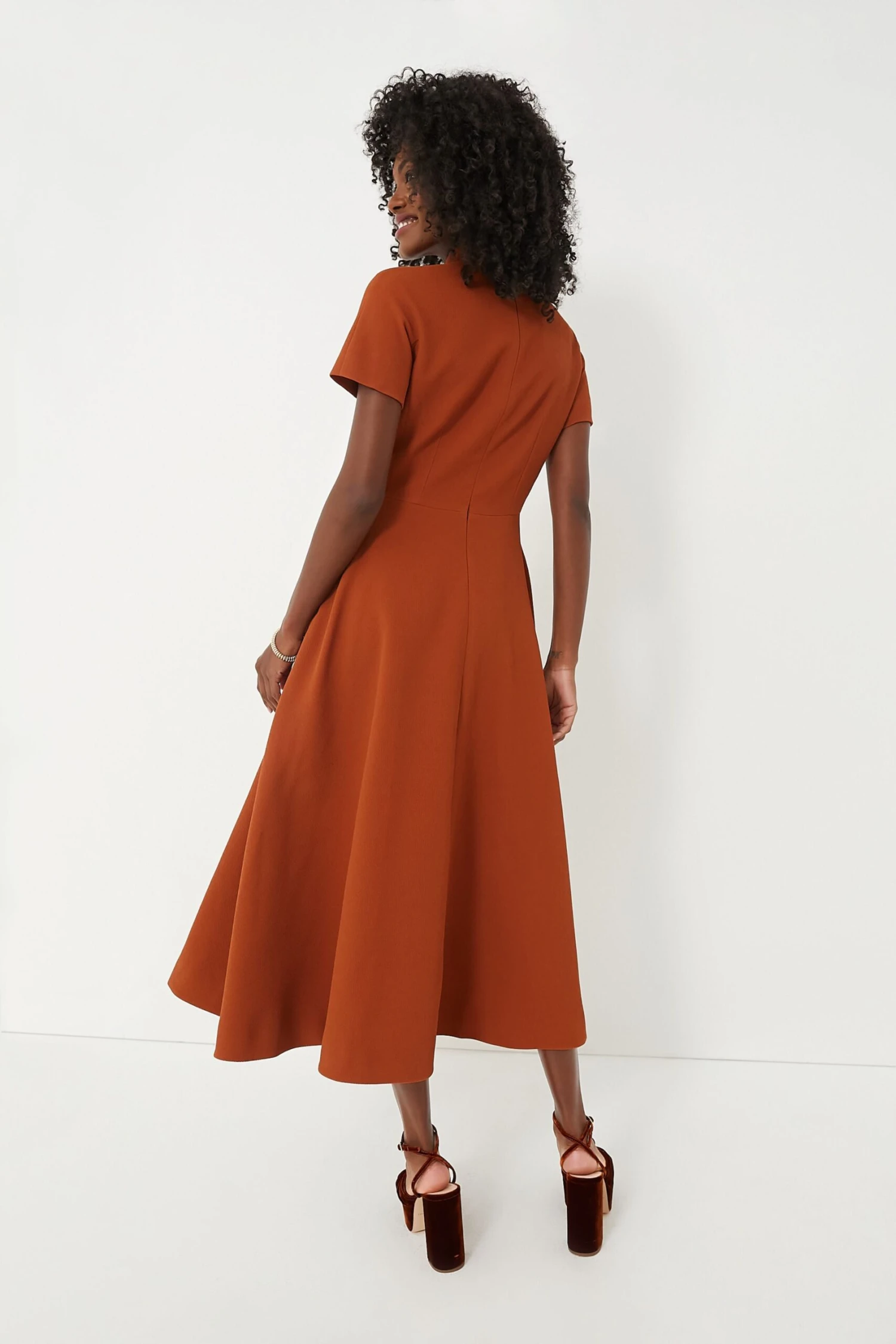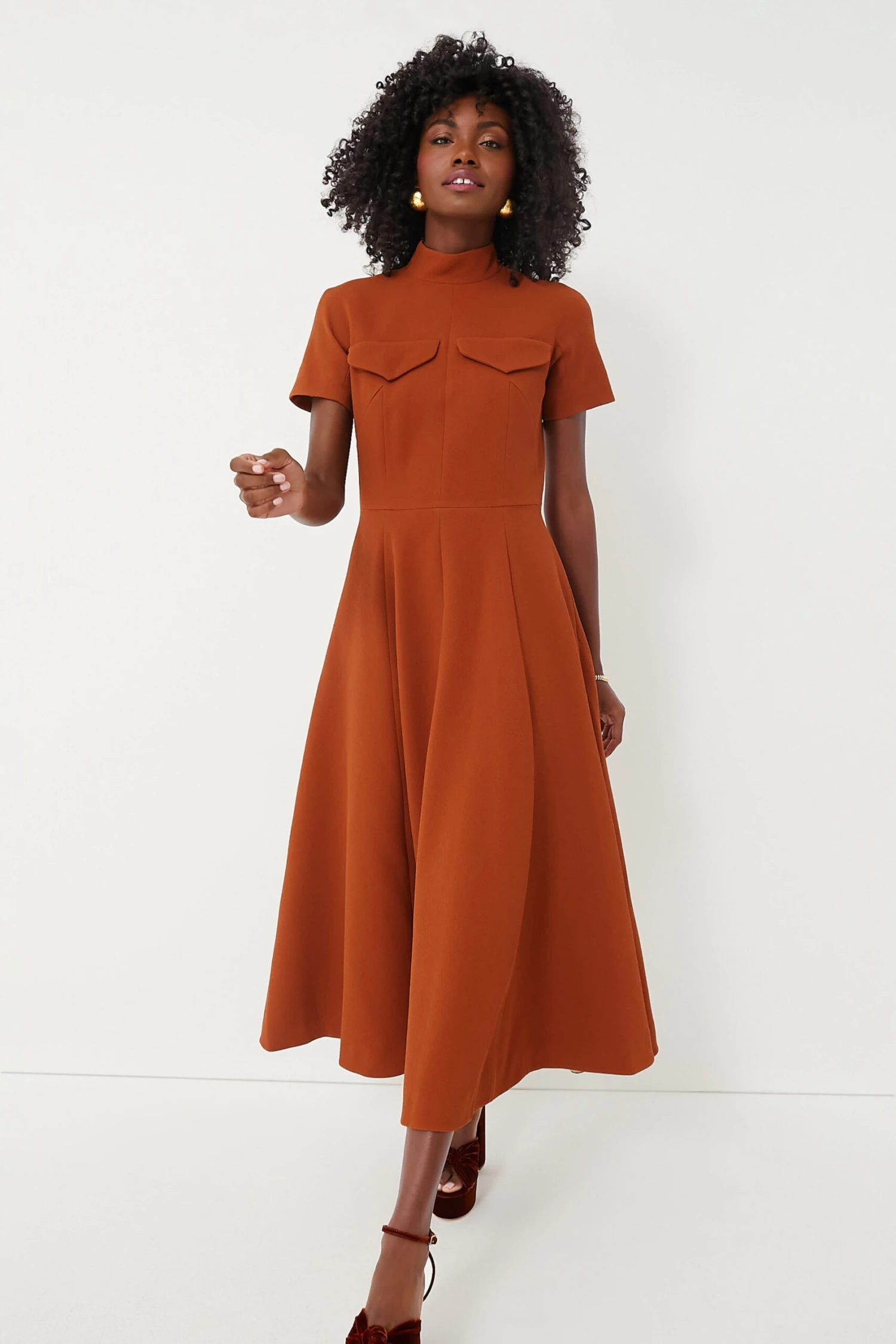 Indulge in timeless elegance with the Amber Brown Catrine Double Crepe Dress. Featuring a mock neckline, short sleeves, and an unbeatable fit-and-flare silhouette, this piece exudes classic sophistication. Complete with pleats throughout, this midi has the perfect combination of structure for a figure-flattering fit and swing for easy movement. Style with boots and a trench coat for chilly morning commutes to the office, or pair with heels and a handbag for an elegant ensemble.