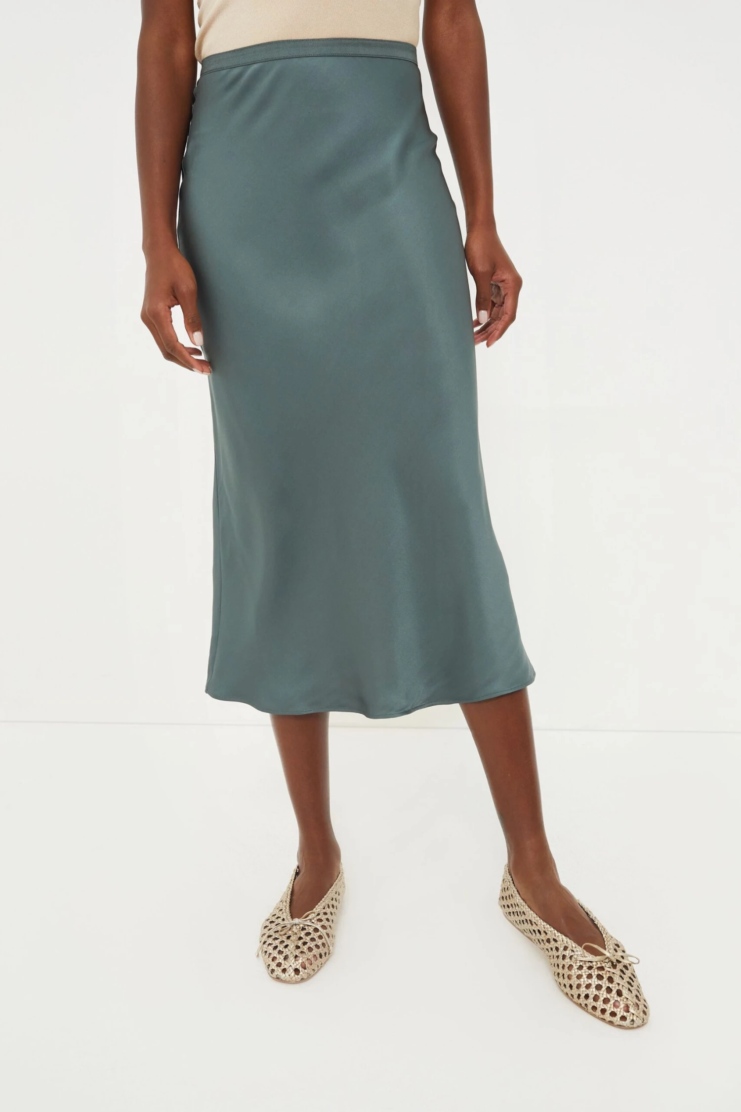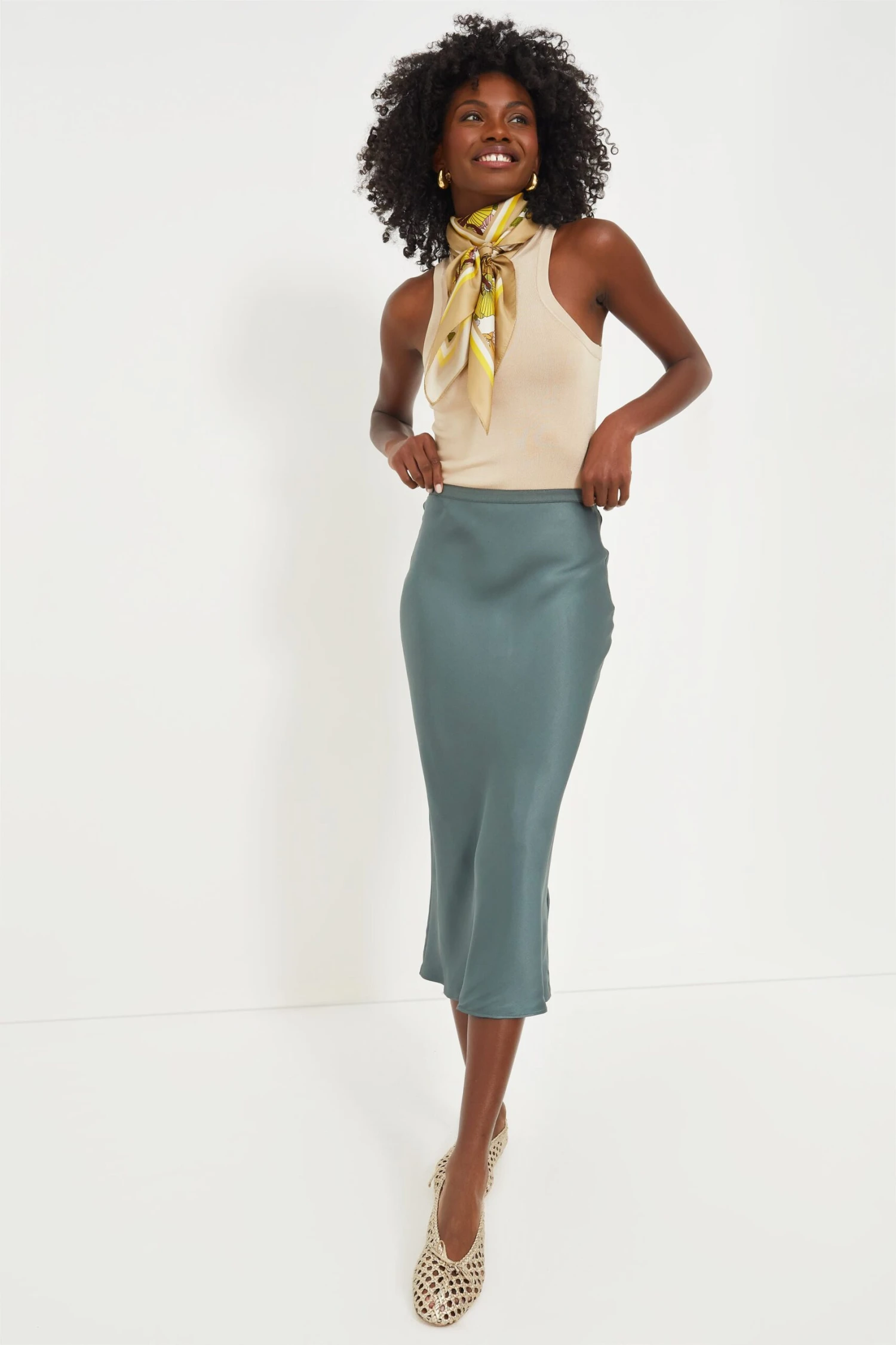 The best-selling Bar Silk Skirt in Dark Sage is made from 100% double-faced silk charmeuse for a smooth silhouette that sits high at the waist and hugs the body through the hips. This style features an elasticated waistband for a comfortable, pull-on construction. Sleek, elegant, and feminine, we are wearing this midi with a tank and heels or with a sweater and loafers for a chic day-to-night ensemble.