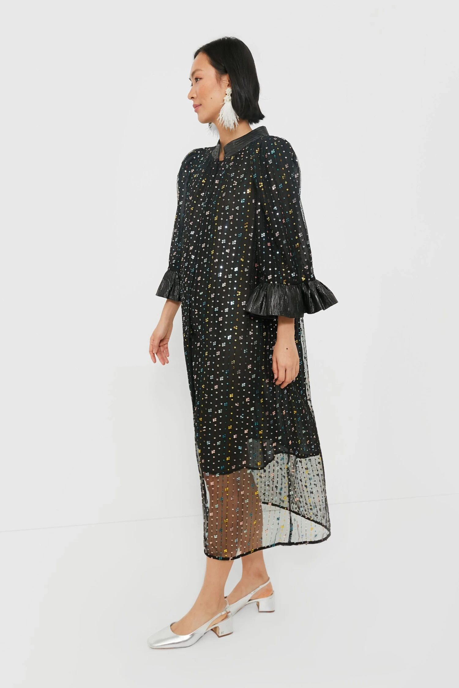 This fun, enchanting, and eye-catching Black Osiris Dress is our new favorite statement midi. With a sheer overlay that is decorated with colorful sequins and faux leather ruffle sleeves, this dress is whimsical while also being classy and season-less. We are pairing it with black heels and silver earrings for a delightful look that is perfect for cocktail parties and formal events.