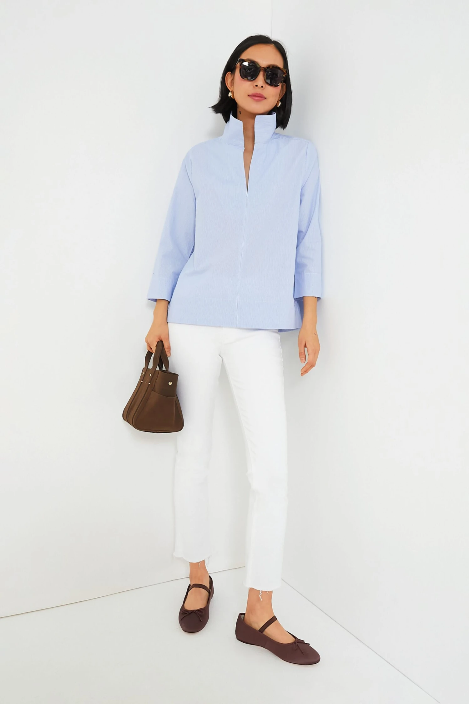 Your staple style gets a fresh update with the Sullivan Blouse. Made from a lightweight and crisp cotton material that provides effortless polish with a classic blue pinstripe print that pairs well with all kinds of neutrals, this stand collared shirt is a must-have in any closet. Style it with denim and sneakers for off-duty weekend wear, under a cardigan with boots when the temps drop, or with a sweet skirt and ballet flats for feminine flair.