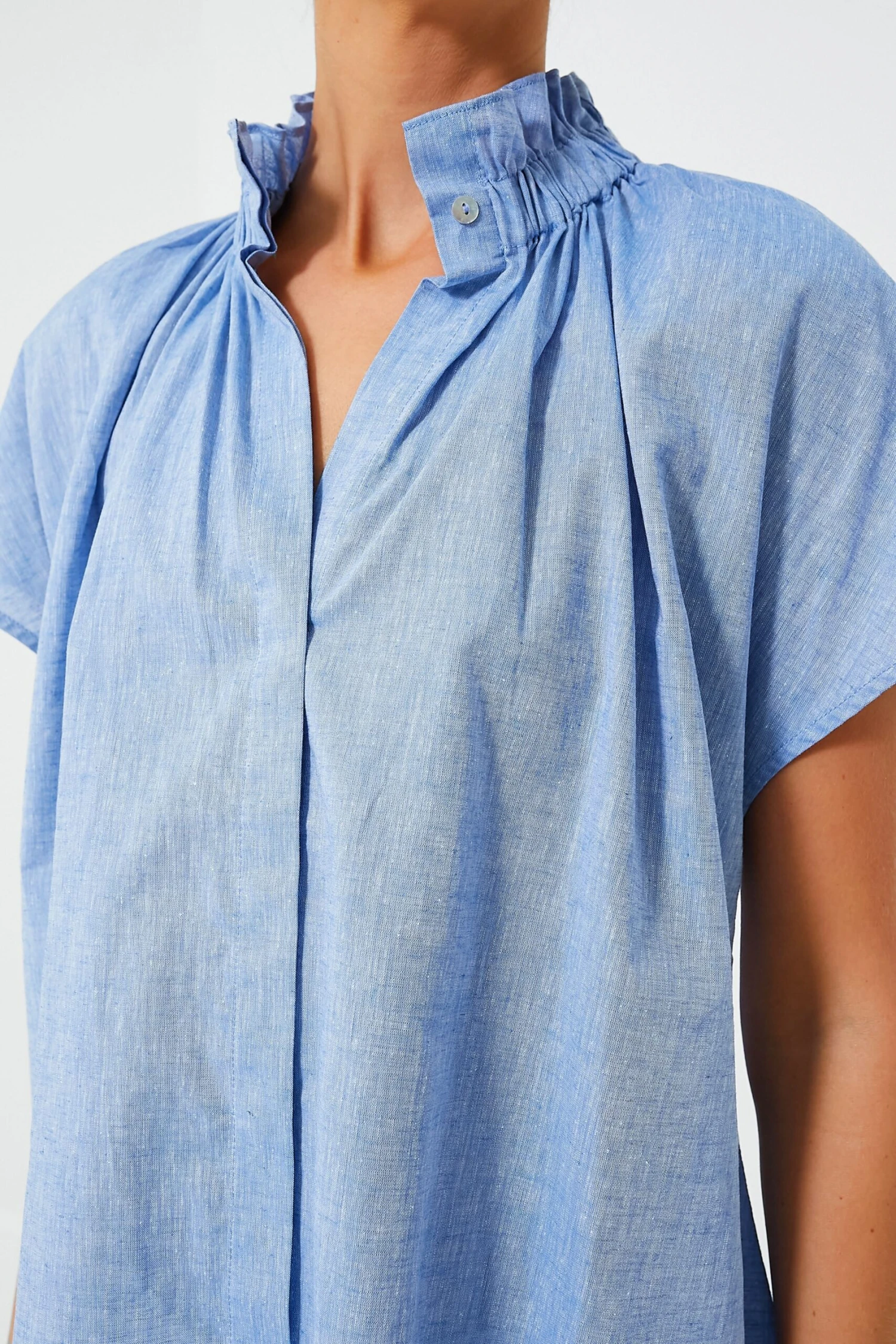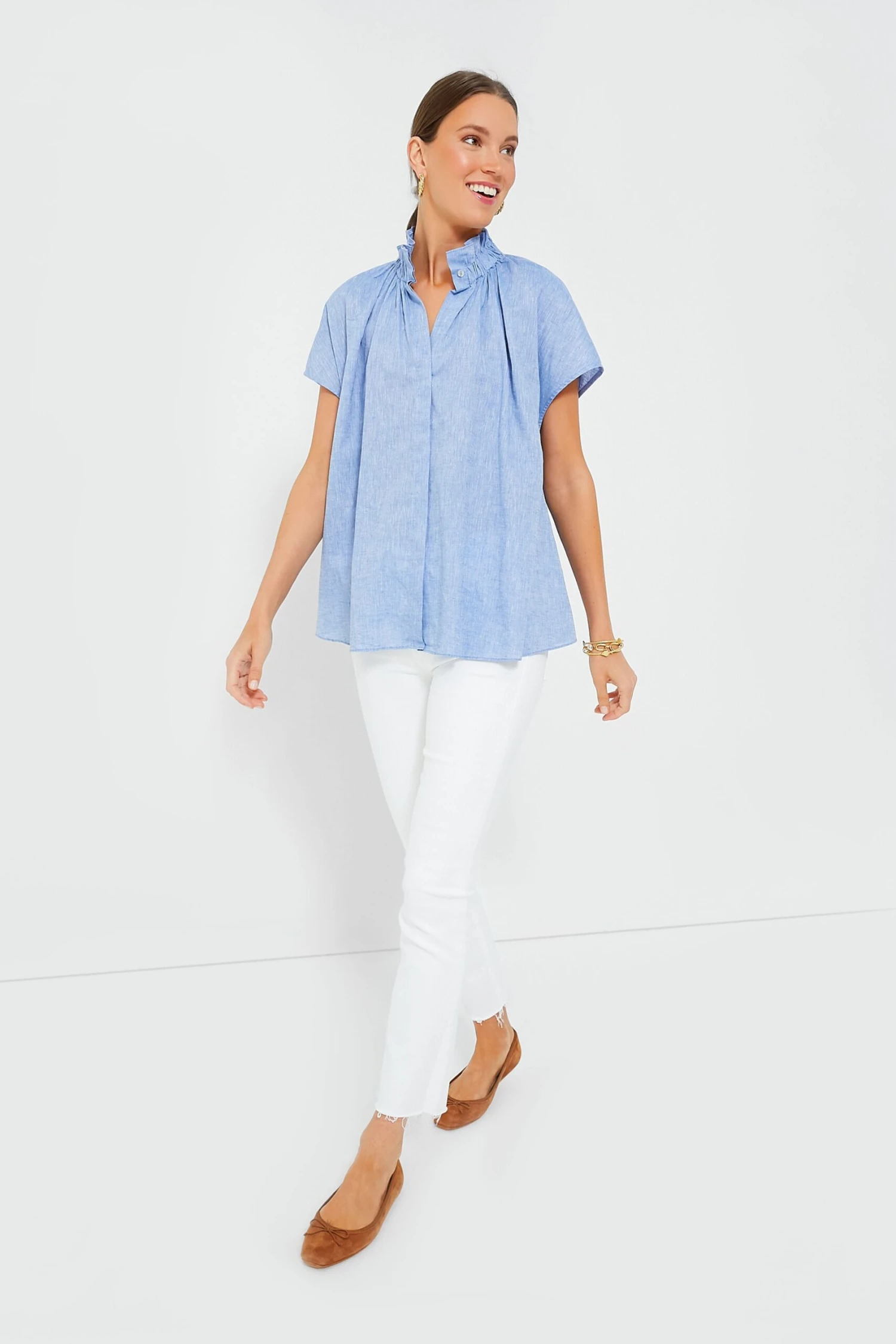 Effortlessly chic, the Rae Blouse takes everything we love about a classic button down and elevates it with fun, feminine details. Featuring a high neck ruffle collar, short cap sleeves, a button front placket, and a simple yet chic chambray fabric, this blue shirt pairs well with denim and flats for daytime and gold jewelry for dining out with friends.
