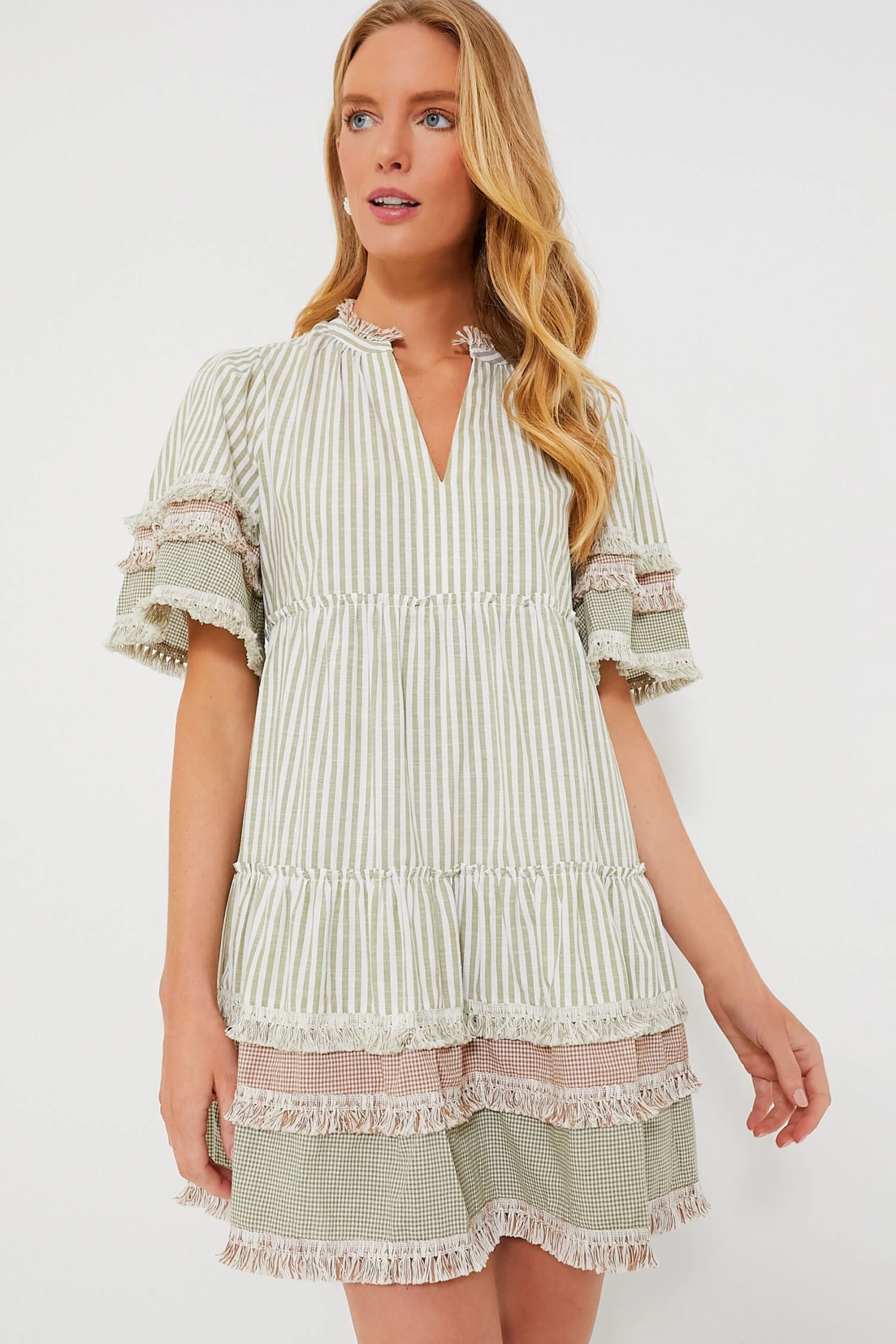 Nothing screams summer more than the Cotswald Crawford Dress. Sage green stripes cover the main body while the cuffs and hem feature subtle neutral checked tiers and fun fringe for a cool take on colorblocking. Featuring oversized sleeves and an effortless swing silhouette, this mini is a flattering yet flirty frock. From walking the boardwalk to backyard BBQs, we are wearing this number with sneakers and sunnies for a casual look, and with wedges and statement earrings for an easy date night look!