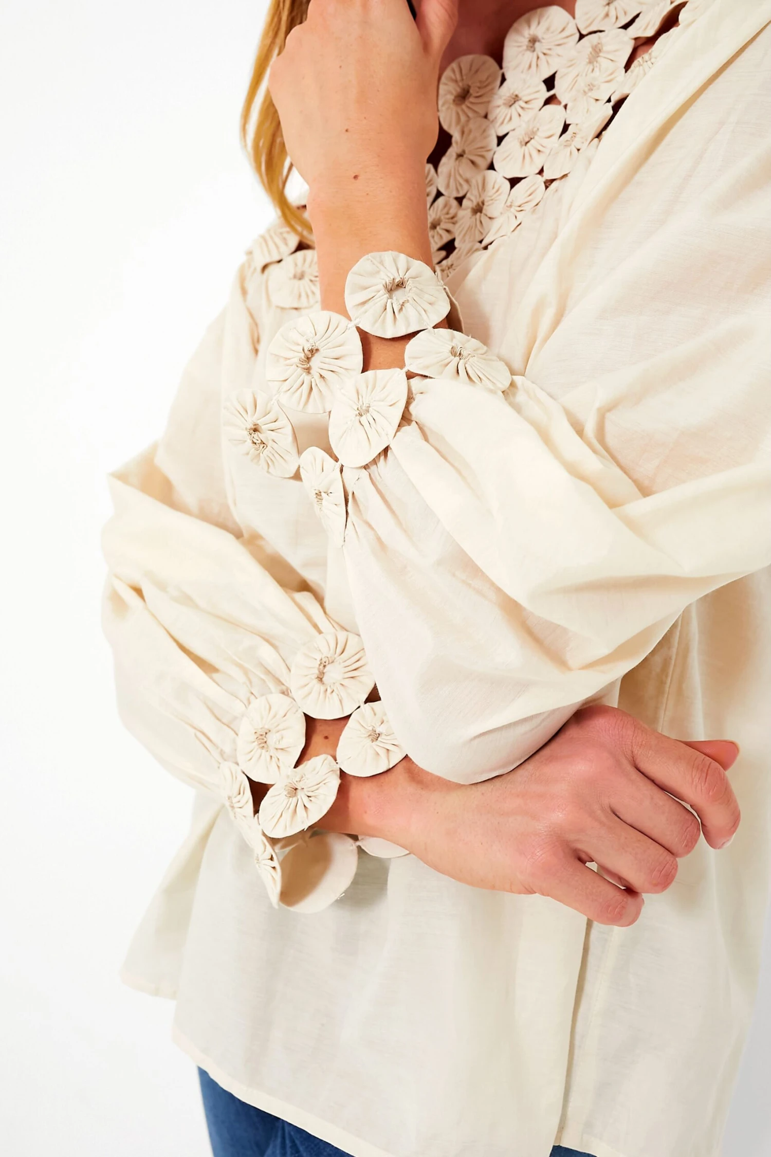 The Cream Rosenberg Blouse incorporates Victorian-inspired details with modern circular cutouts to deliver a stunning silhouette. Complete with a round neckline, balloon sleeves, and pleated detailing for added texture, this billowy beauty is a top you need in your closet! Crafted from a cotton-silk blend, this transitional piece pairs perfectly with denim and gold accessories for running errands to date night.Â