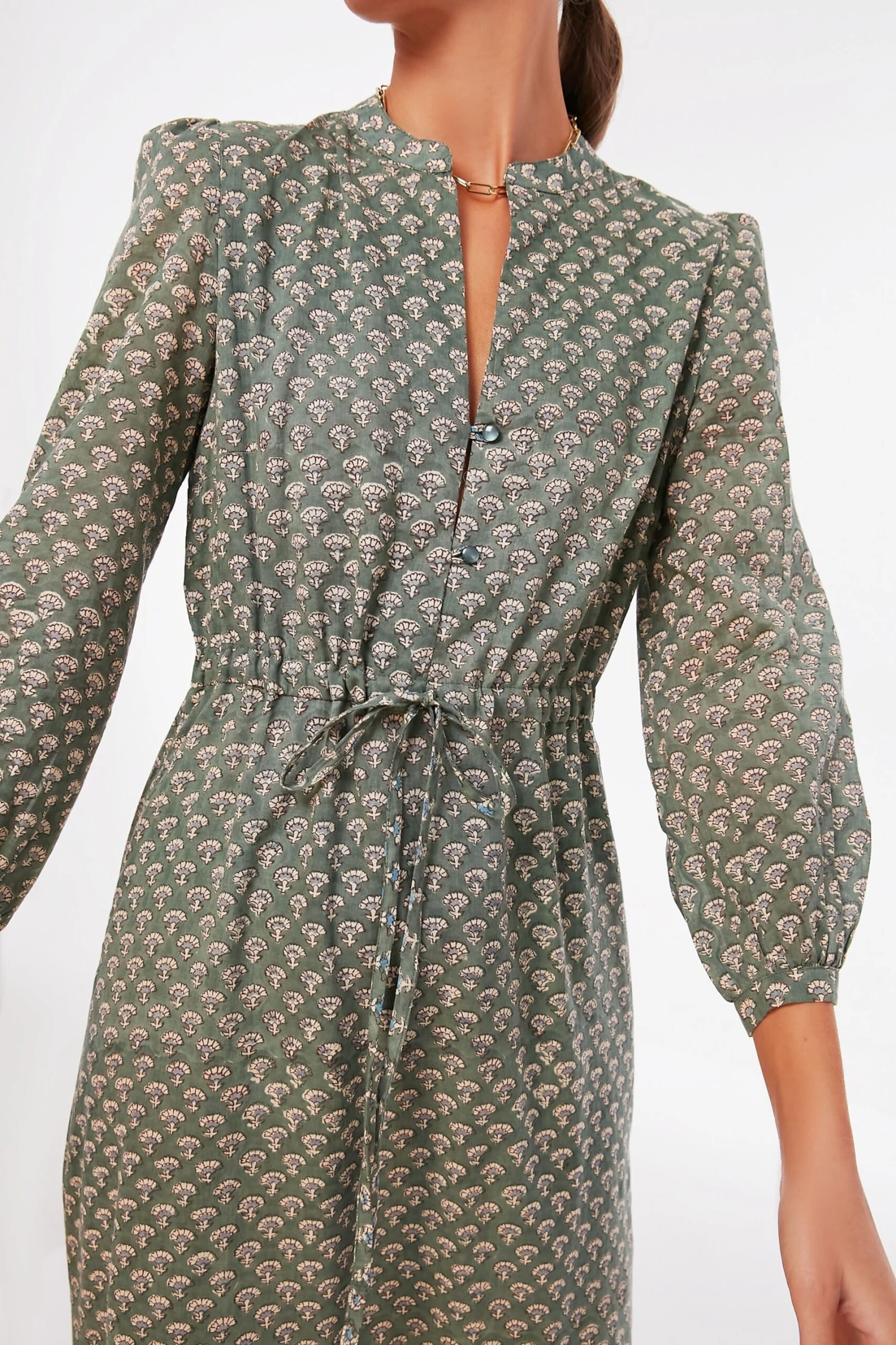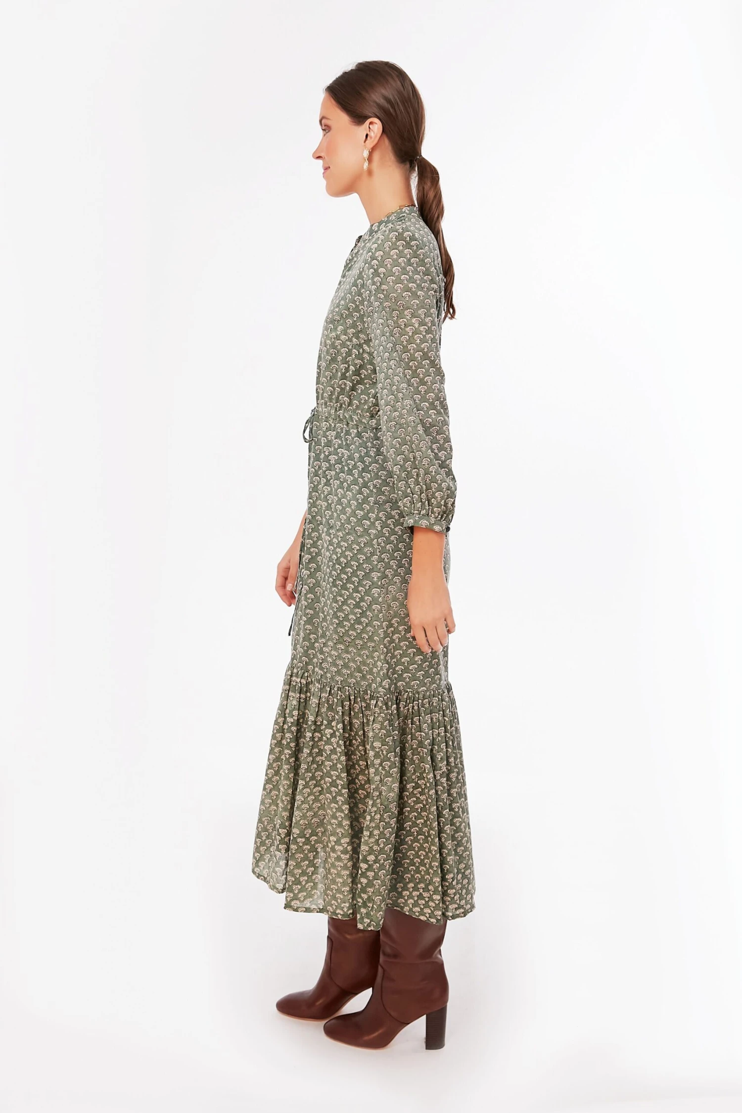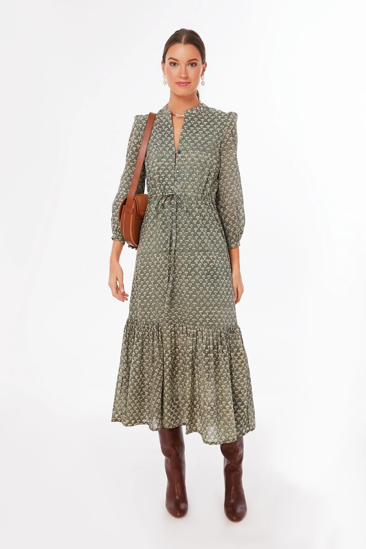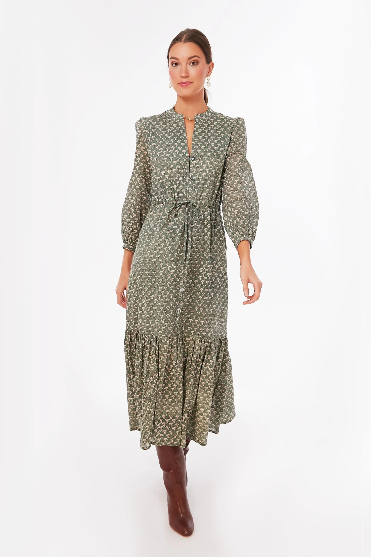 Fall in love with the crisp gray sky with the Day Flowers Juniper Frances 2 Dress. In a gorgeous muted hand block printed green hue, this midi dress features a mandarin collar, a subtle shoulder puff, and a tiered skirt. This fall number is begging to be worn with boots while you catch up with friends over lunch followed by a little retail therapy.