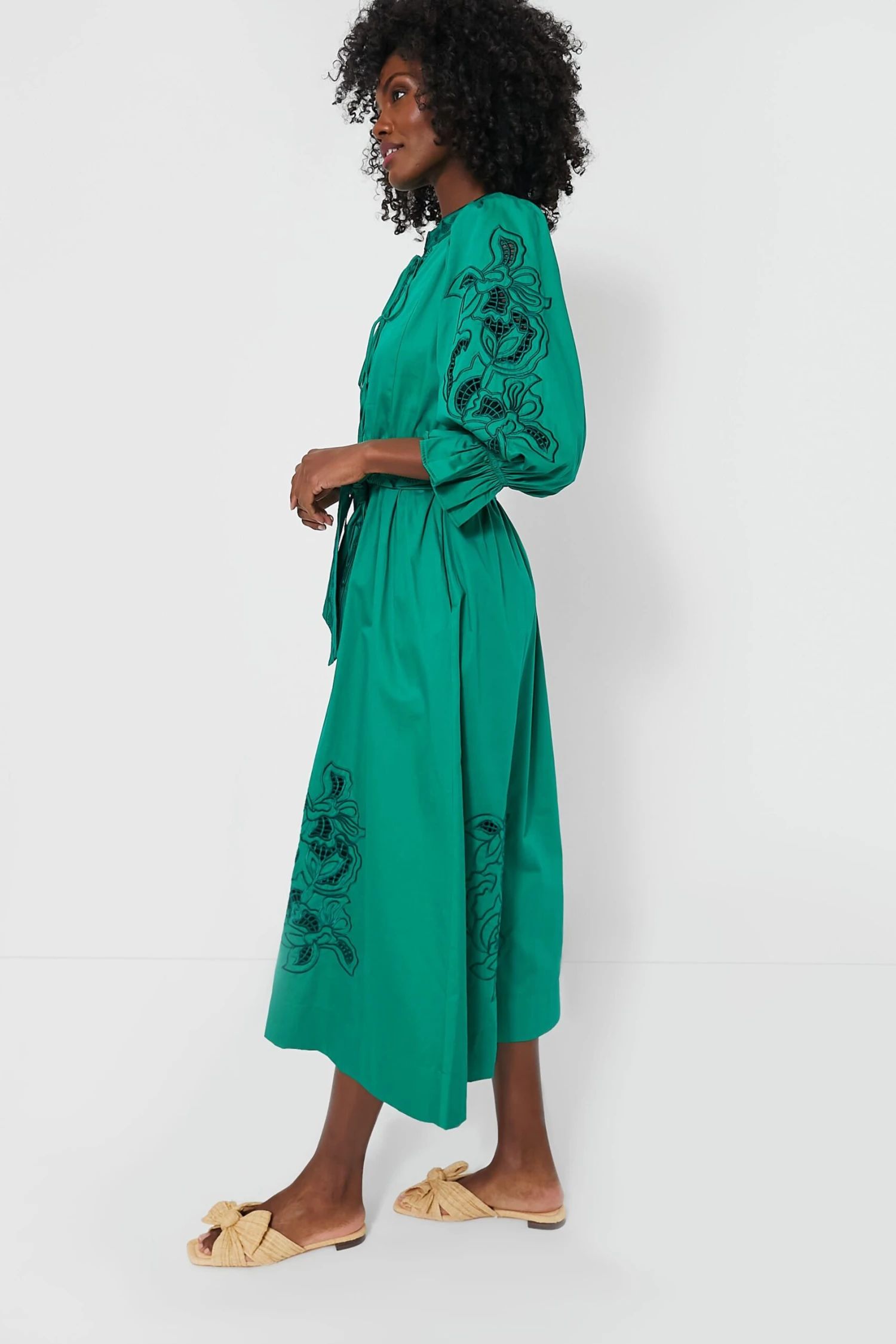 One of Lug von Siga’s signature pieces, this beautiful cotton Emerald Florence Dress is a piece that can smoothly take you to any occasion from day to evening. The sophisticated puff sleeves and hem have hand cut embroidery that reflect craftmanship, texture, and architecture of Anatolia. The removable embroidery belt enhances waistline, while the long cut at the front is tied with neat bindings. Pair with heels and gold jewelry, and you are ready to make an elegant statement.