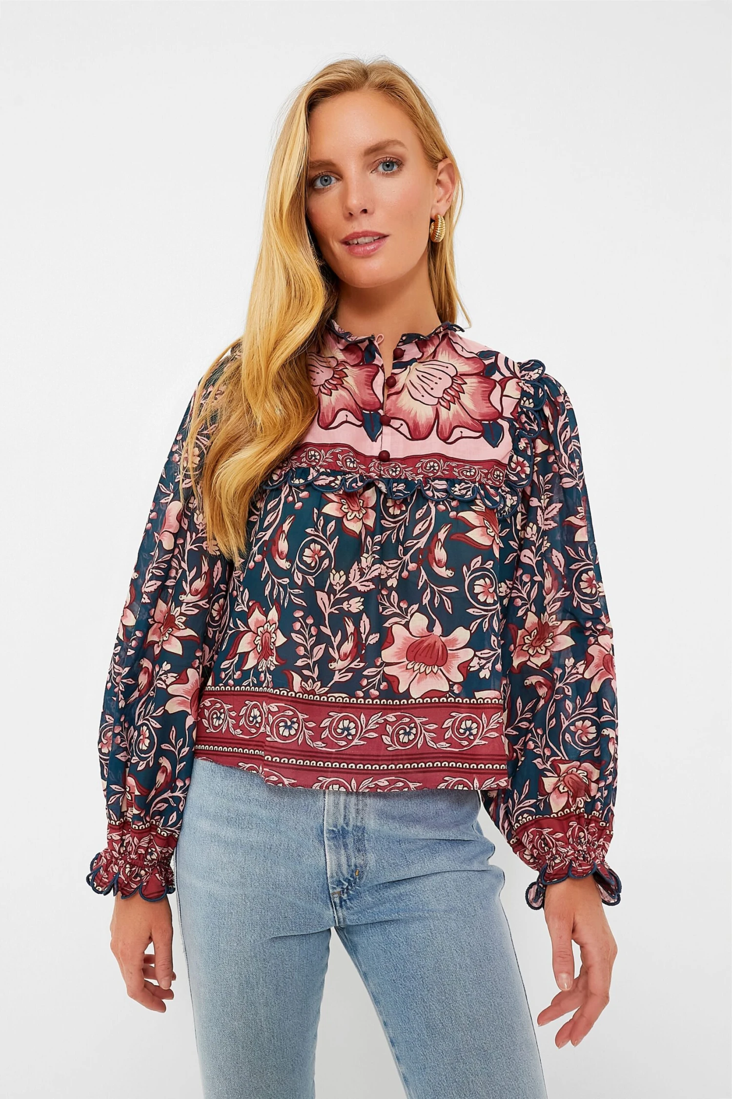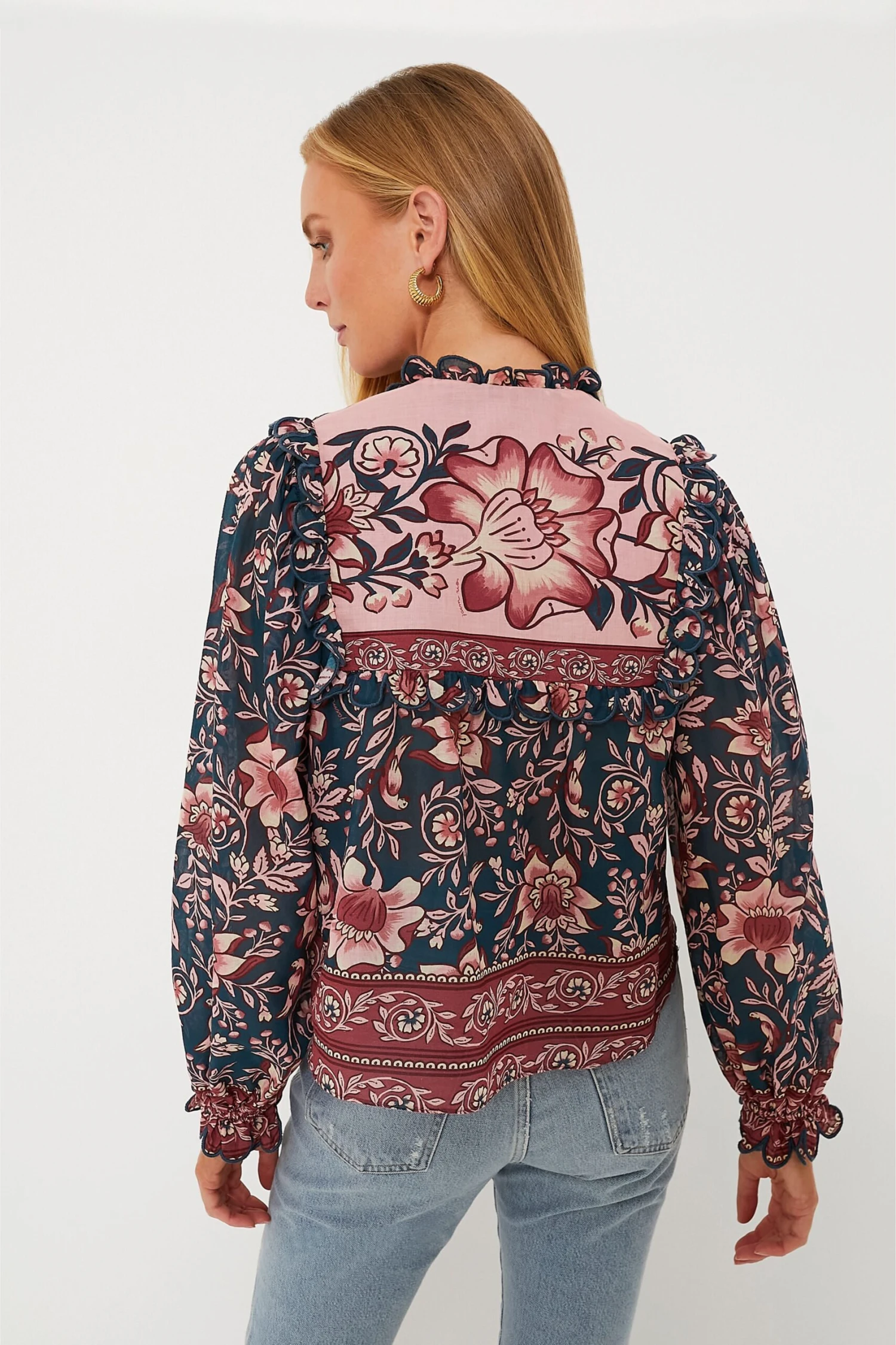 - Ruffle trim at neck, yoke and cuffs