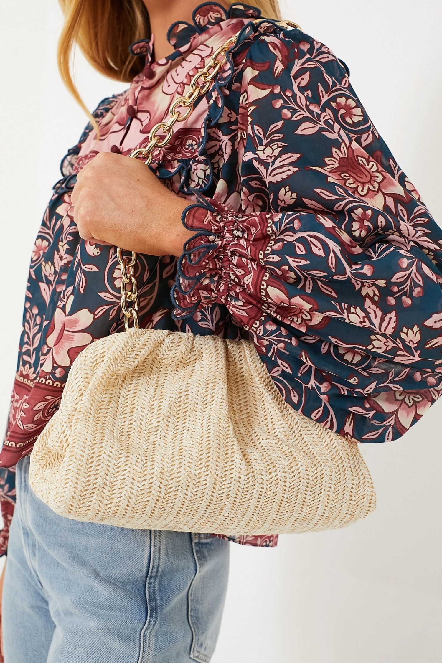 - Long blouson sleeves