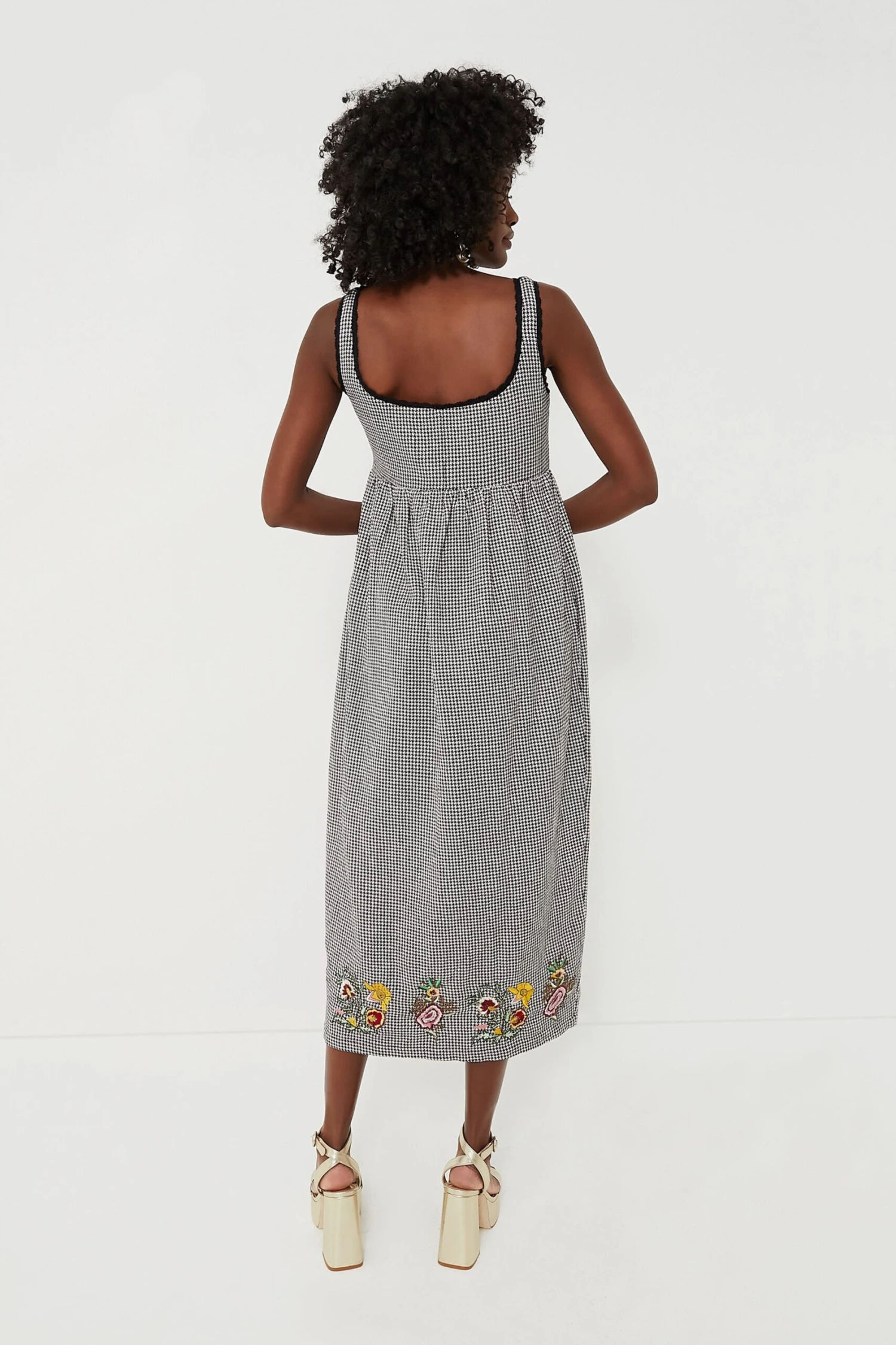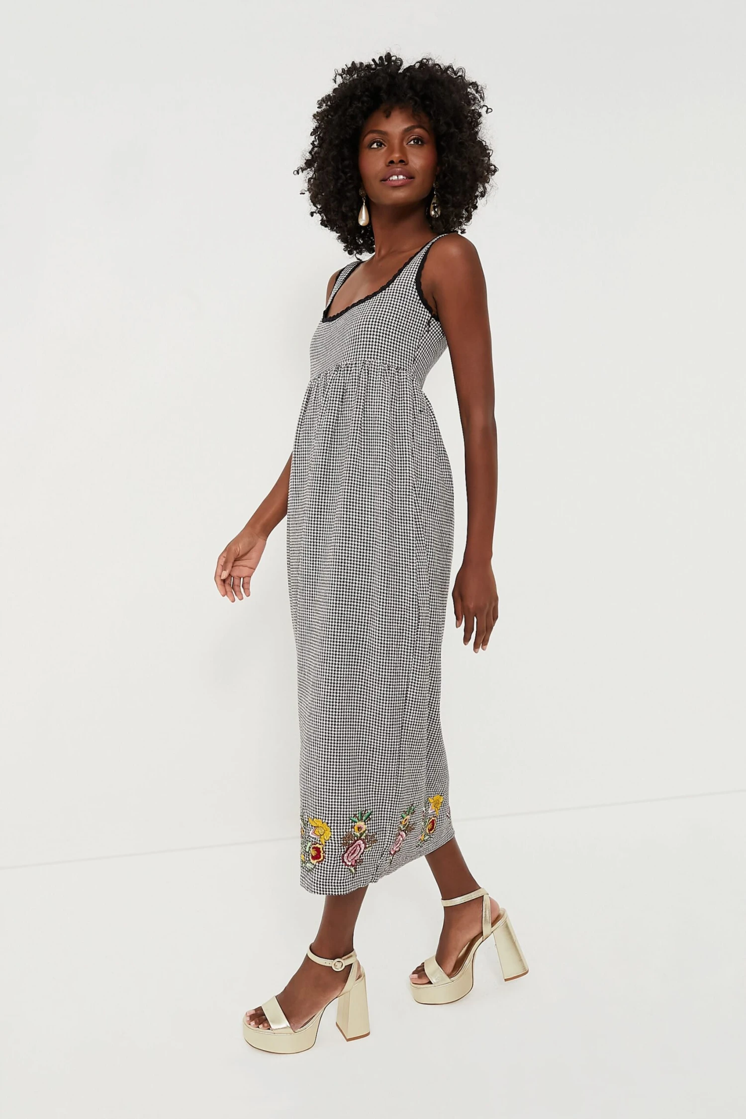 The Houndstooth Emily Embroidered Midi Dress is the epitome of easy-wear elegance. It has an empire waist that flows with ease into a skirt. Delicate crochet lace borders the edges of the neckline and armholes. For the finishing touch of perfection, placed embroidery full of playful colors lines the bottom. Pair with a colorful heel or black western boots!