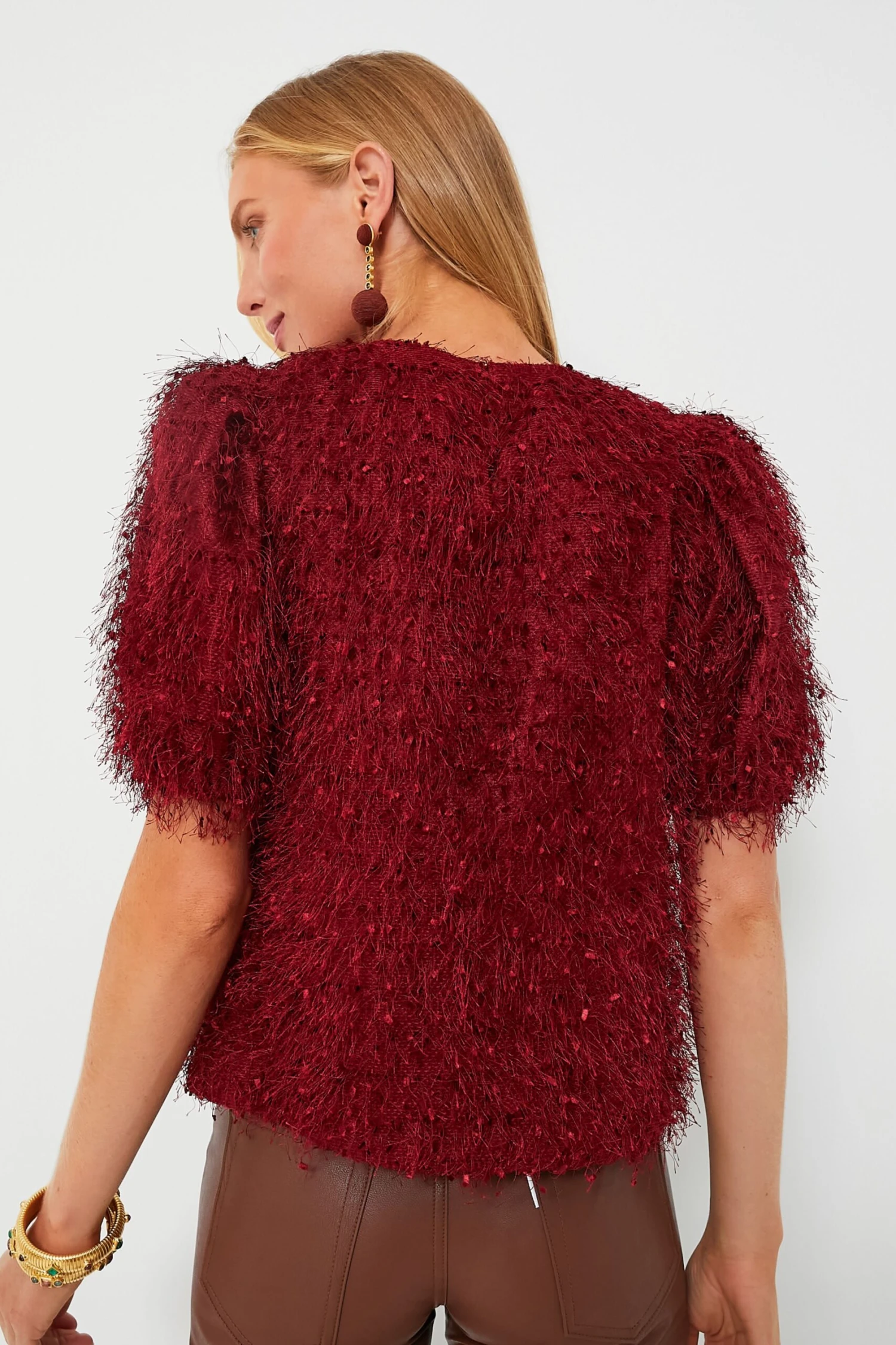 Make a chic statement in the Merlot Hope Blouse. The classic silhouette is upgraded with a textured fabric and deep, rich hue. This top can be the star of the show on its own or styled with fun accessories to create a whimsical and eccentric look. We are pairing this with a black maxi skirt and gold earrings for an elegant dinner party.Â