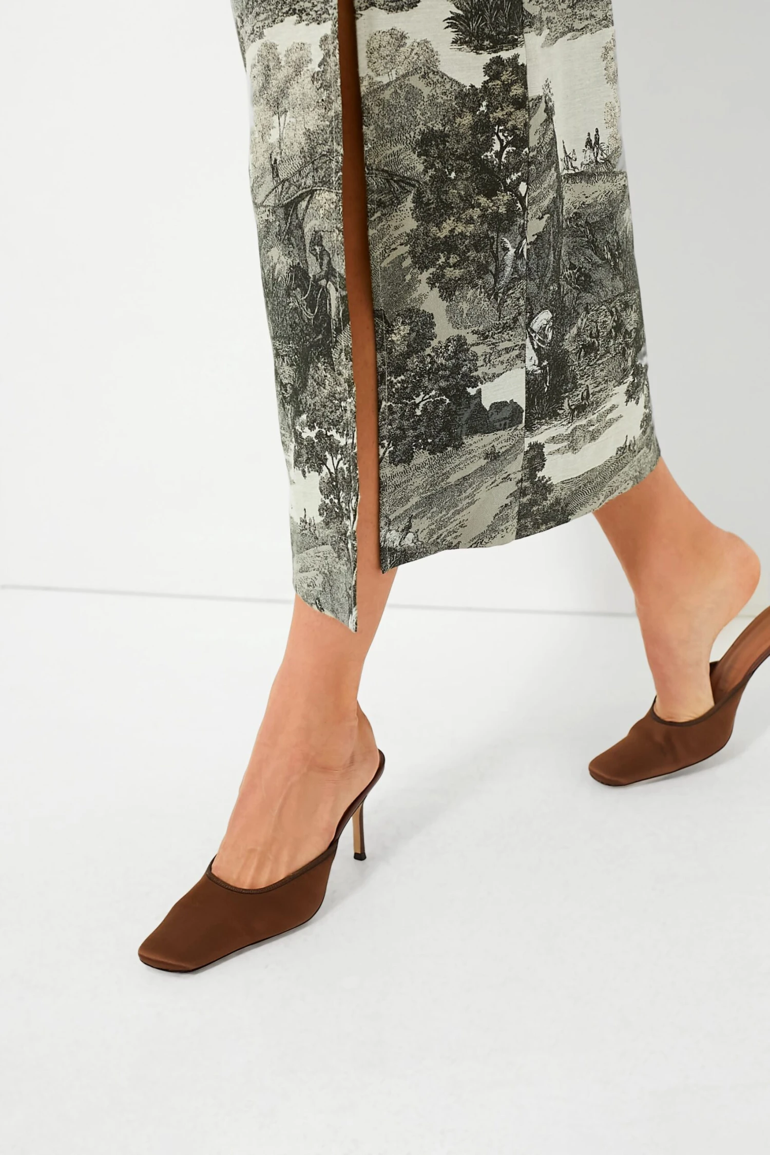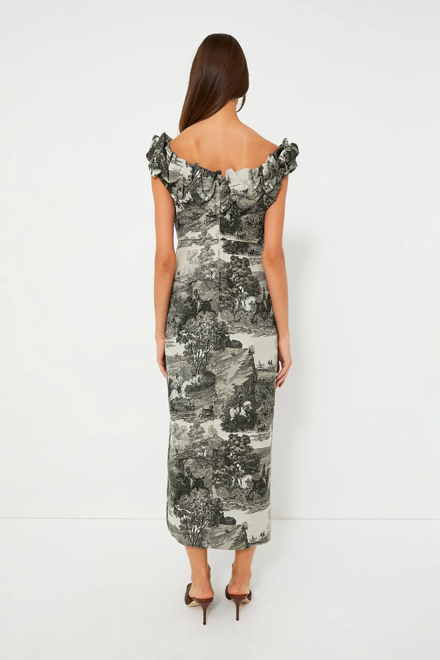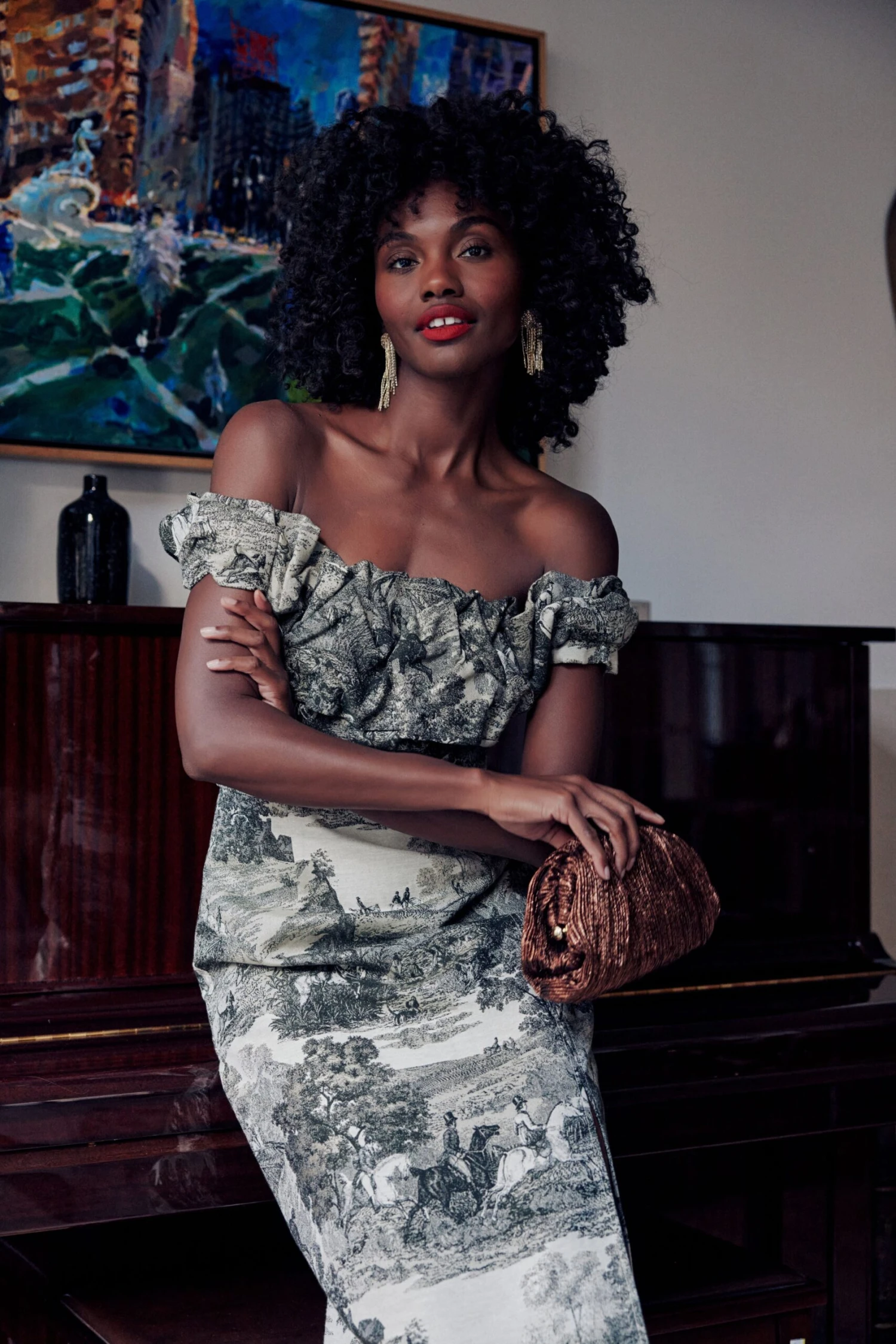 The Middleburg Toile Suze Dress is an exquisite style that is perfect for elevated occasions. With an off-the-shoulder neckline with magnificently textured gathering, a slim column silhouette, and a Victorian-inspired fabric, this look is graceful and elegant while still being modern. Pair with heels and a gold necklace or simple ballet flats for a feminine look that will be the belle of the ball.