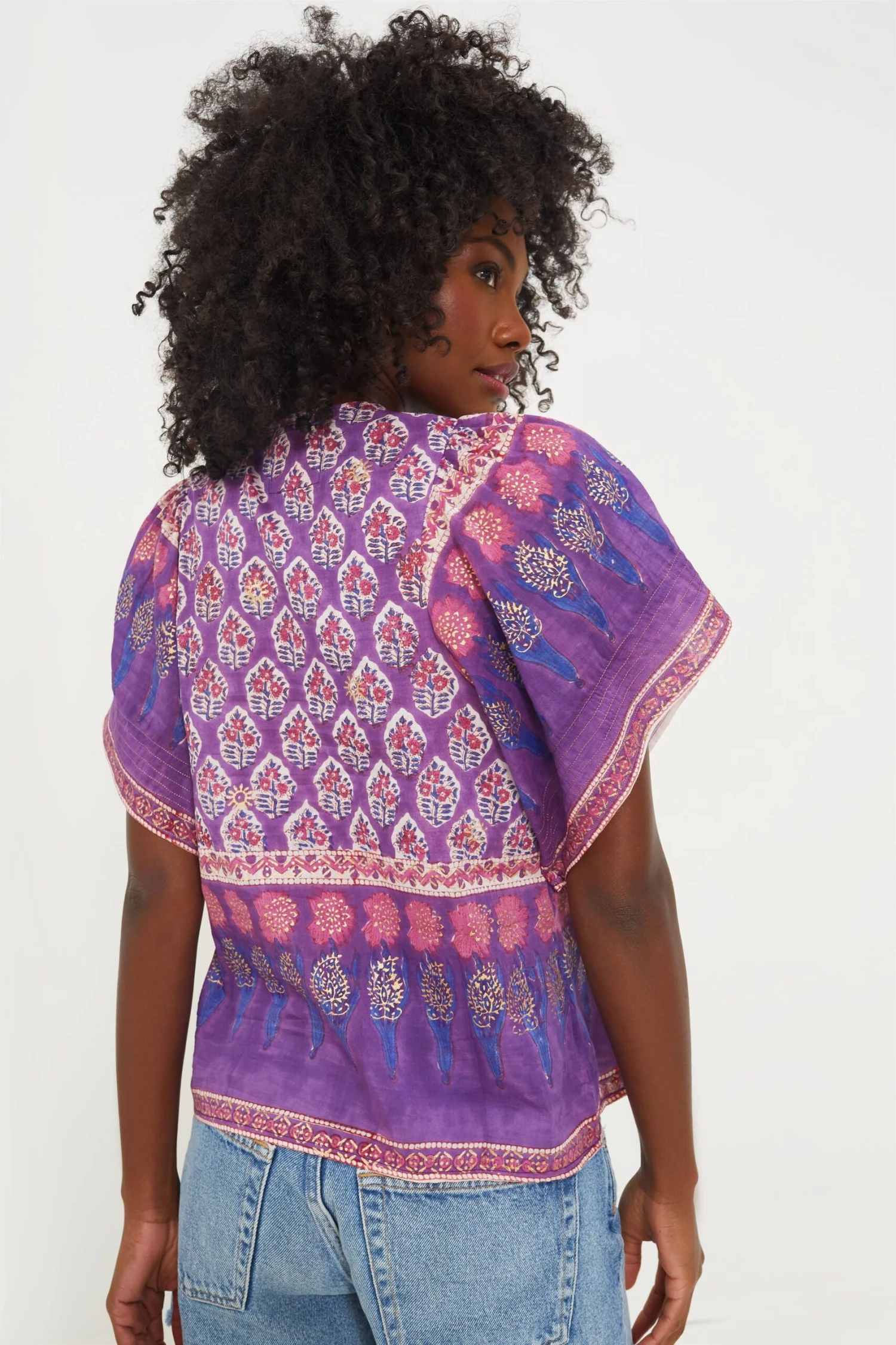 The Angel Top is unapologetically sweet and summery. This cotton blend number features charming flutter sleeves, decorated tassel neckties that can be tied or left undone for playful movement, and to top it off; a hand block-printed design that combines shades of blue, pink, and purple for a unique and feminine finish. We are wearing this to everything from park picnics, backyard BBQs, beach getaways and more. Style with white denim and lace-up neutral sandals for a go-to look, or dress it up with a matching Purple Print Mandy Maxi Skirt, heels, and gold hoops.