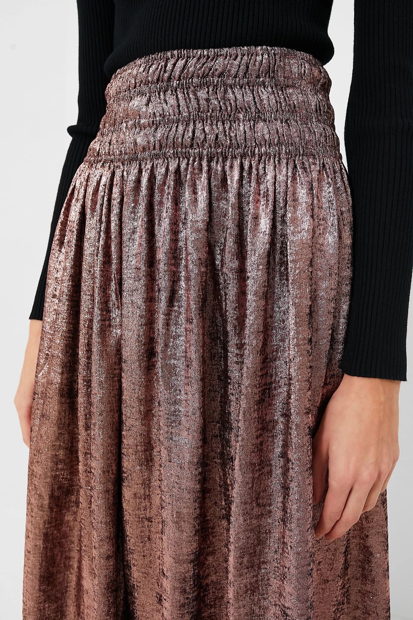 Go beyond basic with the Viola Skirt in Rose Gold. This eye-catching piece features a beautiful flowy drape and a comfortable smocked elastic waistband for a stylish snug fit. Perfect for special occasions or a touch of glamor in your everyday look, wear it with tucked-in blouse and heels for a sophisticated and chic ensemble, ensuring you shine with confidence.