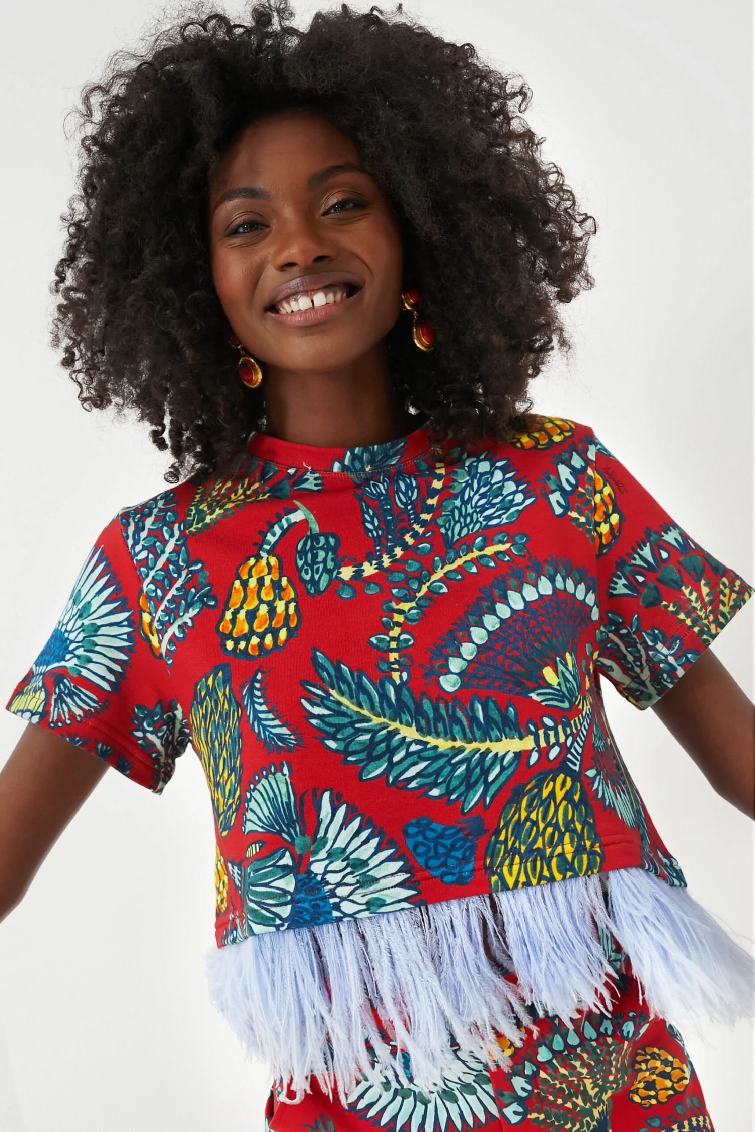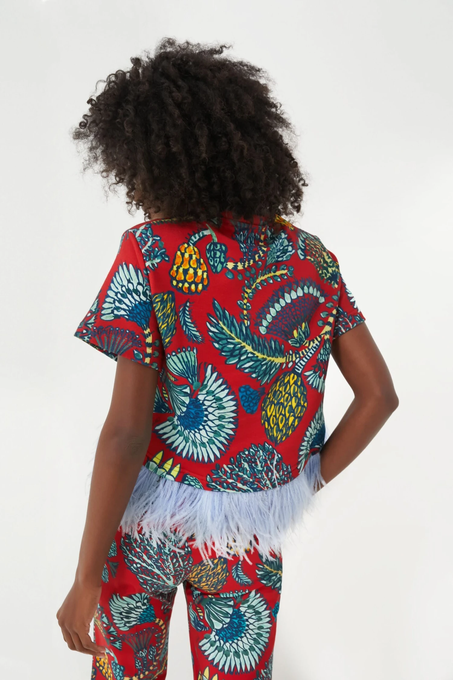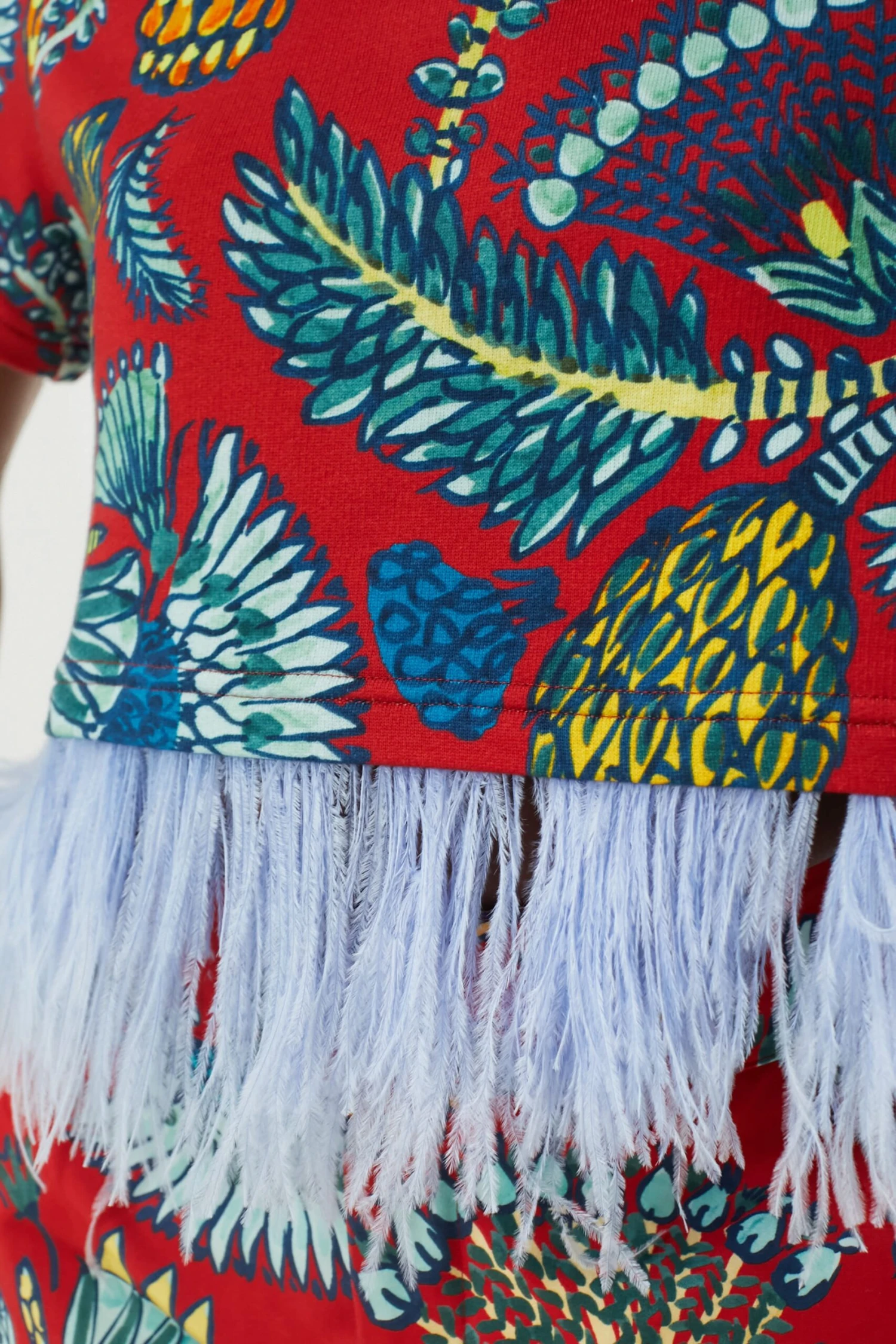 Want to add a little drama to the everyday? Allow the Sicomore La Scala Tee to take to the stage. This beauty features a cropped T-shirt silhouette with a fabulous contrast ostrich feather trim. As great for a sassy city look as it is for special events, this is a staple for your closet with plenty of fun details. Style with high waisted jeans and pumps for date night, with a mini skirt and a clutch for your next RSVP, or with the matching Sicomore Hendrix Pants for a coordinated maximalist look!
