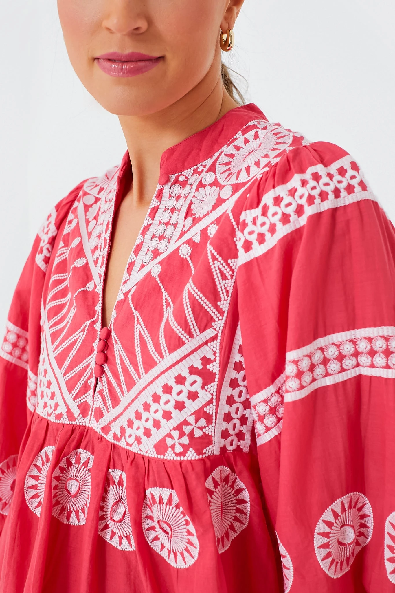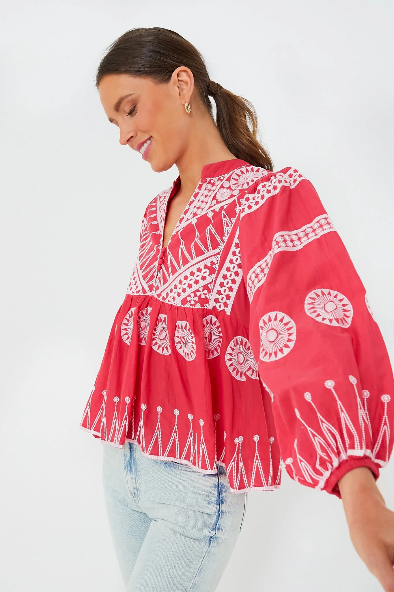 Add some spice to your closet with the Soleil Red Mandarin Balloon Sleeve Top. With a chic, bohemian sensibility, this top is full of charming details such as a mandarin collar and notched neckline with covered buttons. A swingy, airy shape perfect for warm weather destinations, we love to pair this style with white denim and strappy sandals to sip cocktails at sunset.