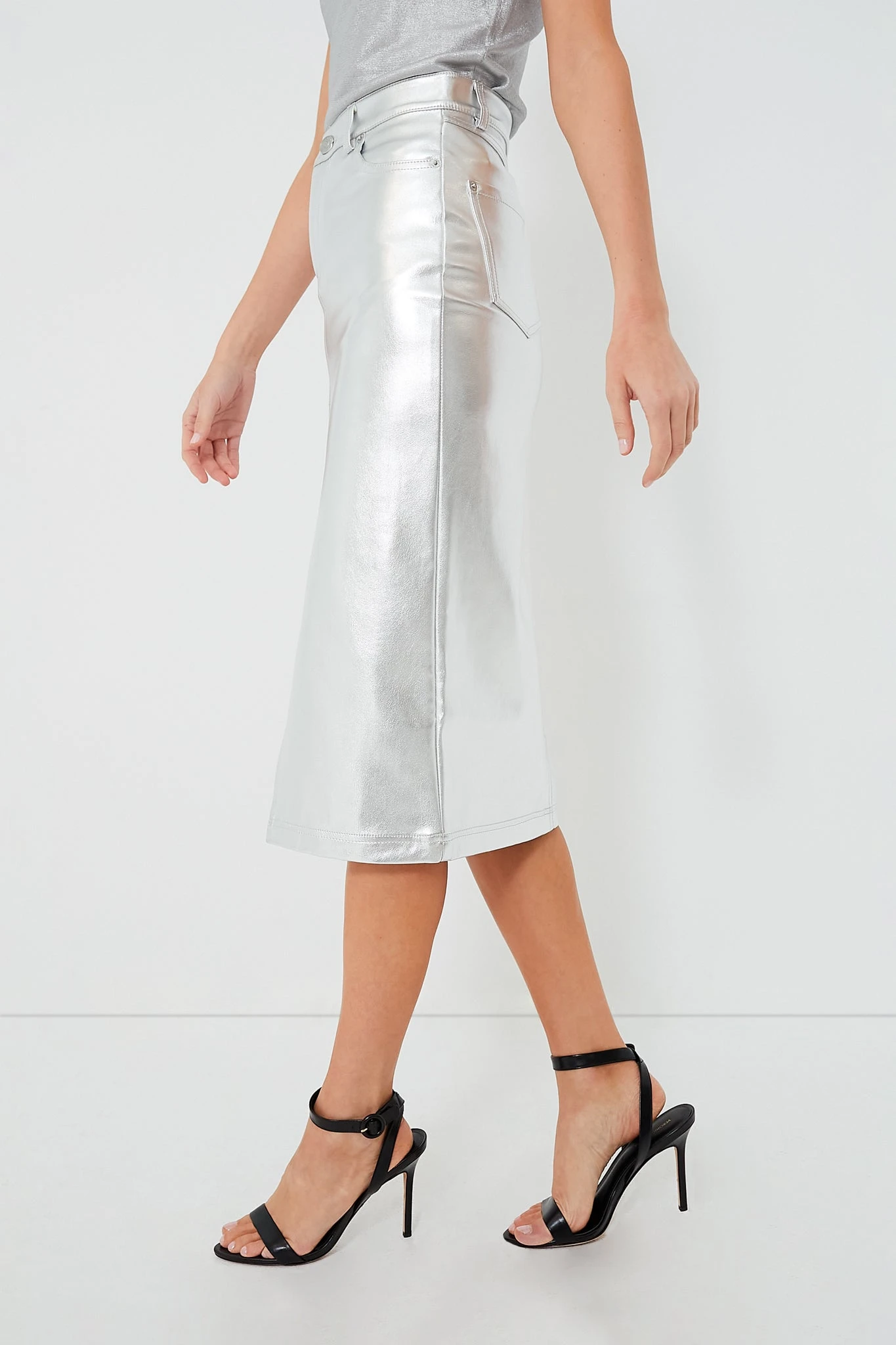 Shine in the Silver Oaklyn Skirt- a straight column skirt in metallic vegan leather. The classic silhouette is upgraded with the gleam of silver, creating a flattering and eye-catching look that can be styled for hundreds of occasions. Pair with a graphic tee and sneakers for a metropolitan rock-chic look, or pair with the Silver Ayana Top for a chic matching set.