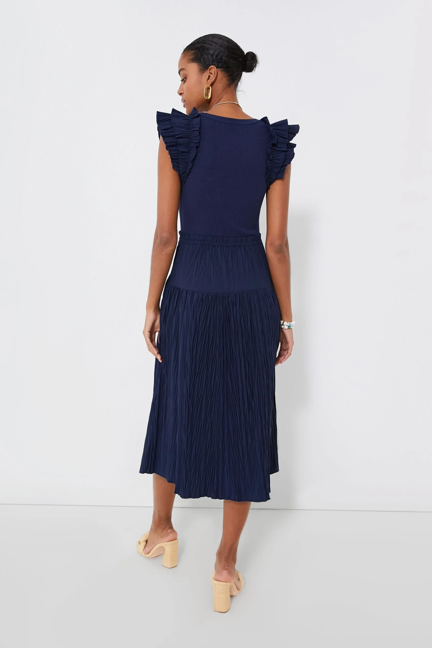 Why wear a separate shirt and skirt when you can wear the Midnight Virginia Dress? This silhouette creates the illusion of a tonal set with a ribbed tank on top and a pleated cotton poplin skirt on bottom — then it is taken up a notch with layered ruffle shoulder straps for a touch of fun volume. Subtle yet dramatic in equal measure, this midi can be dressed down with sandals and sunnies to grab brunch with your besties, or can be dressed up with wedges and statement earrings for an event at the country club!