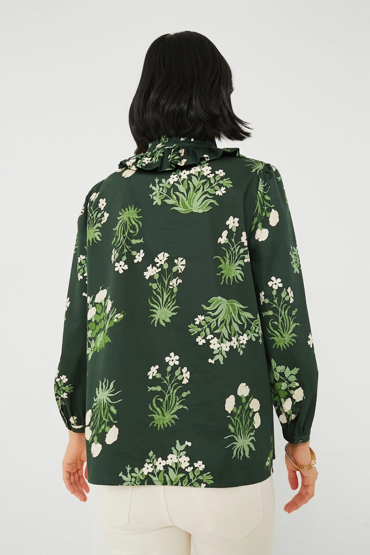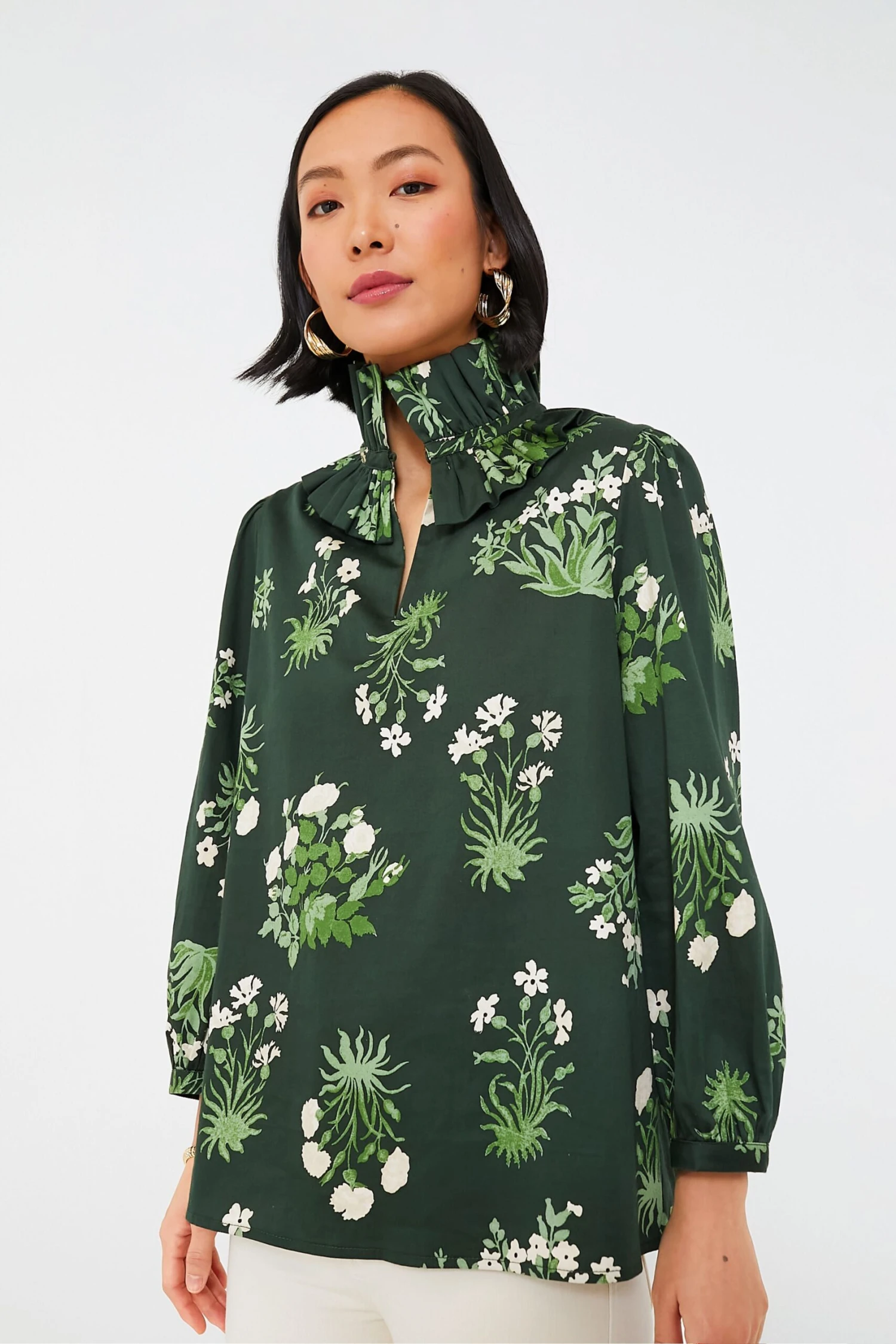 The Viridian Stamped Bouquets Bouvier Blouse is the perfect combination of femininity and sophistication. A stand ruffle collar plays well with the fresh botanical print full of rich green shades. Equally appropriate for Sunday brunch or special celebrations, itβs no wonder this blouse is a Tuckernuck favorite. We are pairing this bold stunner with go-to denim and classic flats for a subtle look, then swapping for heels and gold accessories for evening festivities.