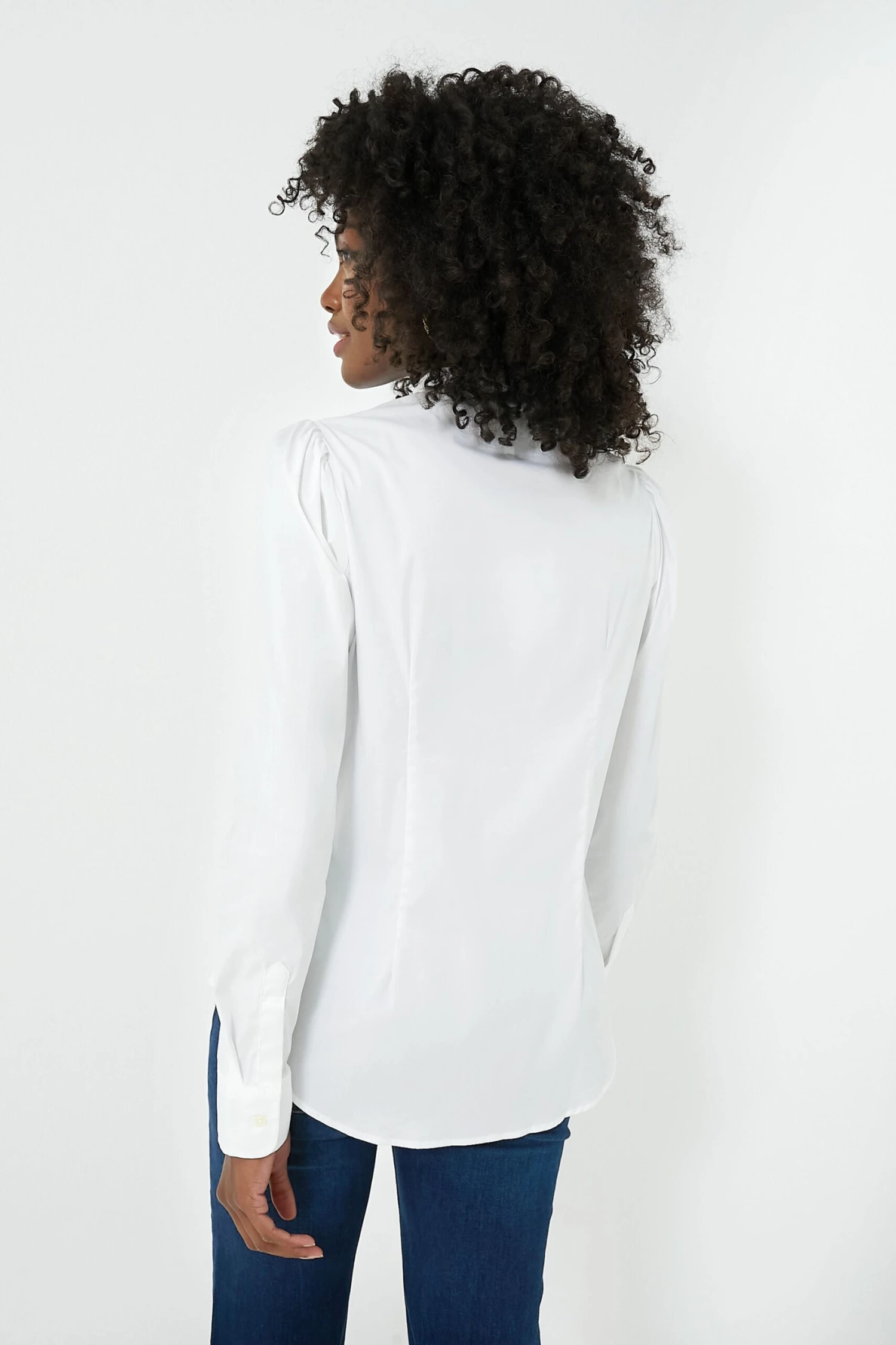 For business or pleasure, the White Puffed Shoulder Shirt is shapely in all the right places with subtle gathering at the shoulders and stand collar. Featuring long sleeves, a front button placket, and No Gape® button technology, this silhouette has got you covered (literally!). Beautifully made from cotton and produced in Portugal by local artisans, we are styling this piece with flared denim, pumps, and statement earrings for the perfect desk to drinks look.